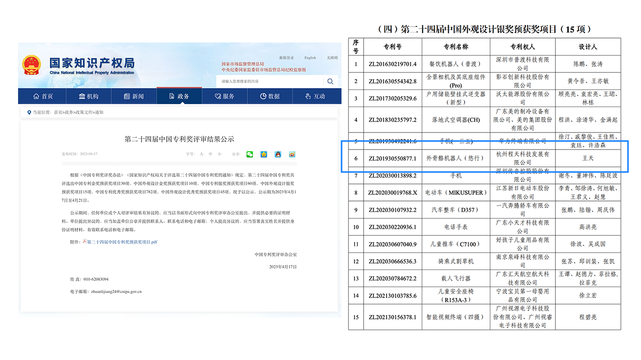近日,第二十四屆中國專利獎名單揭曉,程天科技外骨骼機器人(悠行)(專利號:ZL201930550877.1)榮獲中國外觀設計銀獎。中國專利獎是中國專利領域的最高榮譽,同時受到聯合國世界知識產權組織(WIPO)的認可。