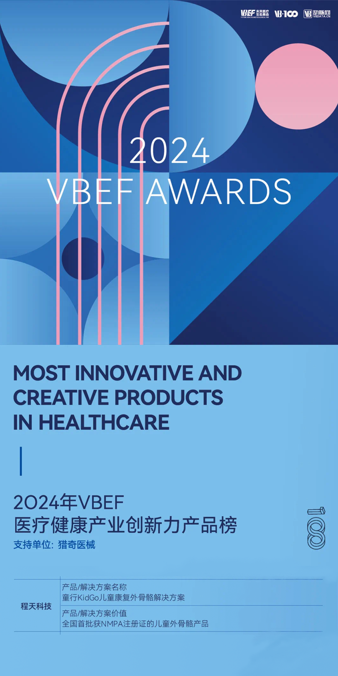 2024VBEF醫(yī)療健康產(chǎn)業(yè)創(chuàng)新力產(chǎn)品榜從技術(shù)創(chuàng)新力、臨床與應(yīng)用價(jià)值、行業(yè)空間、行業(yè)影響力四大一級(jí)指標(biāo)的成長(zhǎng)性與年度表現(xiàn)進(jìn)行加權(quán)評(píng)選,從四大領(lǐng)域(生物藥及生物制品、高端智造及醫(yī)療器械、數(shù)字創(chuàng)新技術(shù)及供應(yīng)鏈賦能產(chǎn)品、醫(yī)療產(chǎn)業(yè)鏈)評(píng)選出共計(jì)200款具有代表性的創(chuàng)新醫(yī)療產(chǎn)品及解決方案。程天科技童行KidGo兒童康復(fù)外骨骼解決方案憑借先進(jìn)的技術(shù),高效的臨床應(yīng)用價(jià)值,廣闊的發(fā)展空間和深厚的行業(yè)影響力入選榜單。