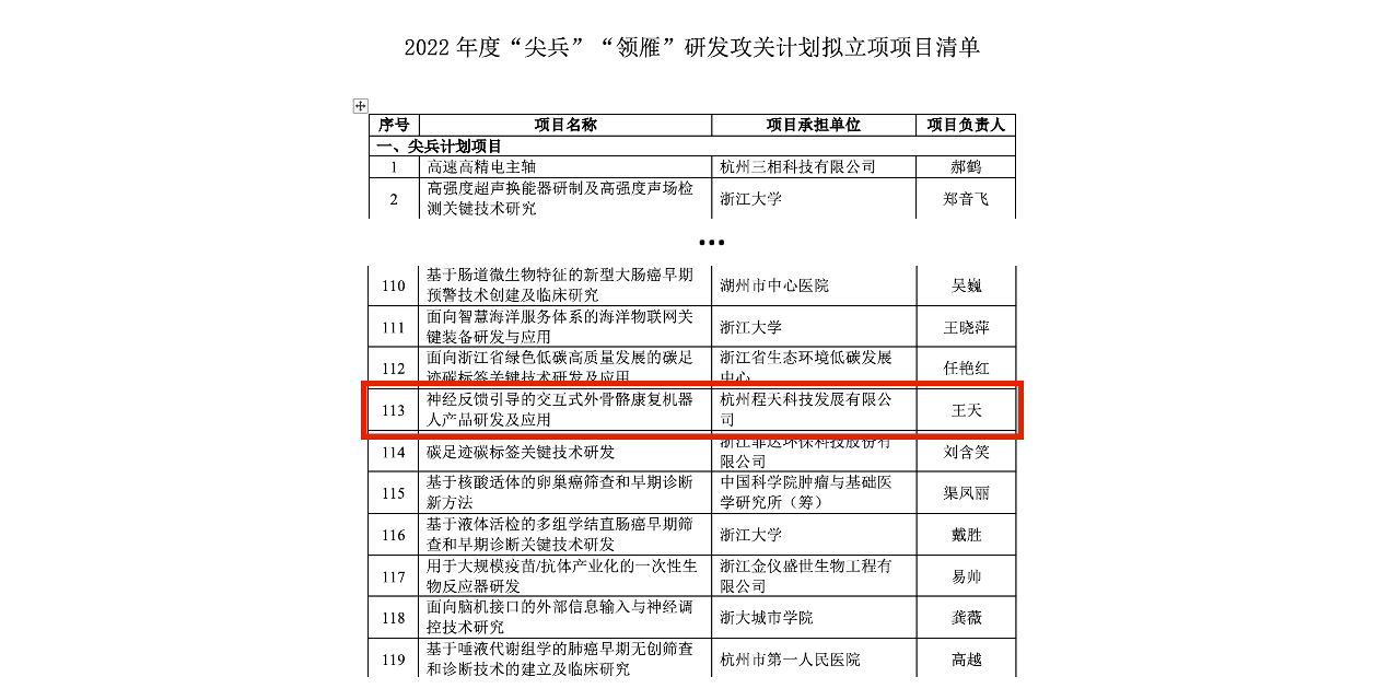 浙江省科學(xué)技術(shù)廳關(guān)于2022年度“尖兵”“領(lǐng)雁”研發(fā)攻關(guān)計(jì)劃項(xiàng)目立項(xiàng)已完成公示。程天科技牽頭申報(bào)的“神經(jīng)反饋引導(dǎo)的交互式外骨骼康復(fù)機(jī)器人產(chǎn)品研發(fā)及應(yīng)用”,連同省內(nèi)其他119個(gè)項(xiàng)目獲得“尖兵計(jì)劃”省重點(diǎn)研發(fā)專項(xiàng),共同支撐浙江高水平創(chuàng)新型省份和科技強(qiáng)省建設(shè),充分發(fā)揮科技創(chuàng)新在高質(zhì)量發(fā)展建設(shè)共同富裕示范區(qū)中的引領(lǐng)作用。據(jù)悉,該項(xiàng)目聯(lián)合浙江省內(nèi)知名高校、研究院所和臨床醫(yī)院協(xié)同完成申報(bào),有效整合企業(yè)和多方多領(lǐng)域資源,共同推進(jìn)外骨骼康復(fù)機(jī)器人行業(yè)發(fā)展。